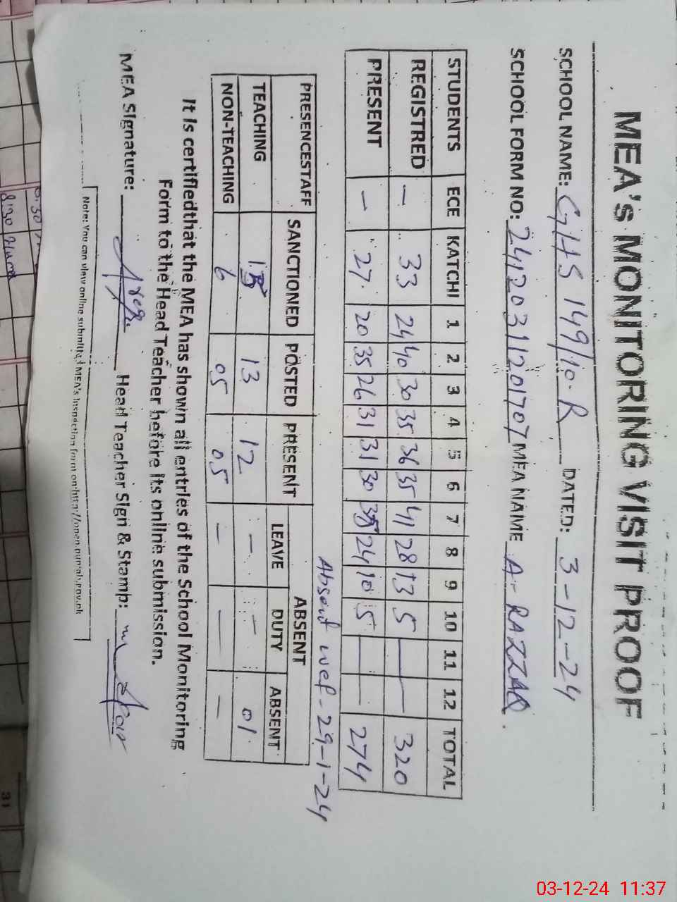 | Attendance Register | Head Teacher | MEA with School | Visit Proof |