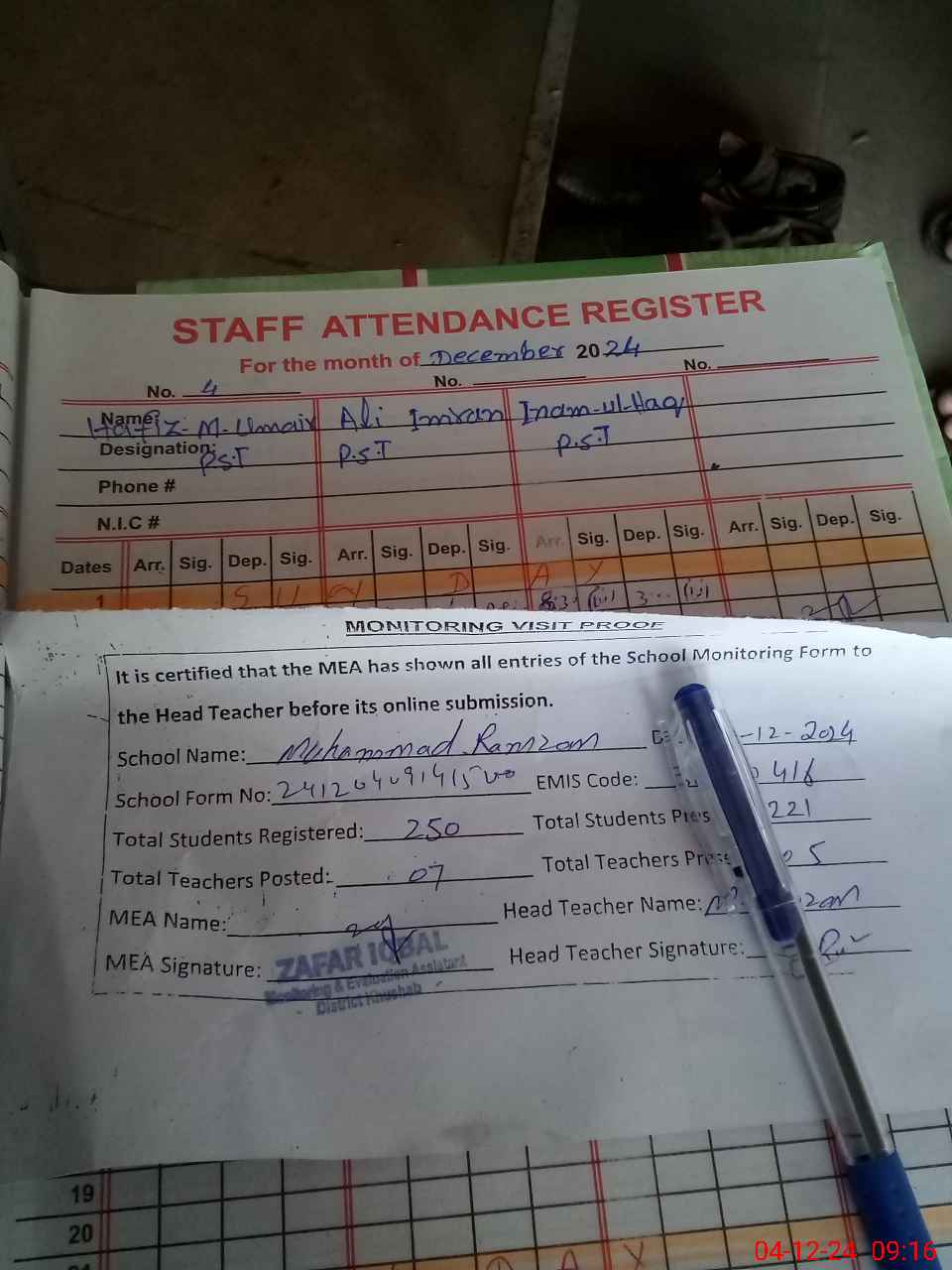 | Attendance Register | Head Teacher | MEA with School | Visit Proof |