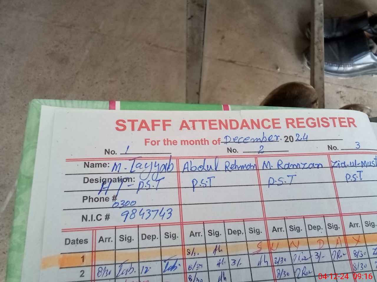| CNIC | Full Name | Designation | R/C | Absence during last cal. month |
