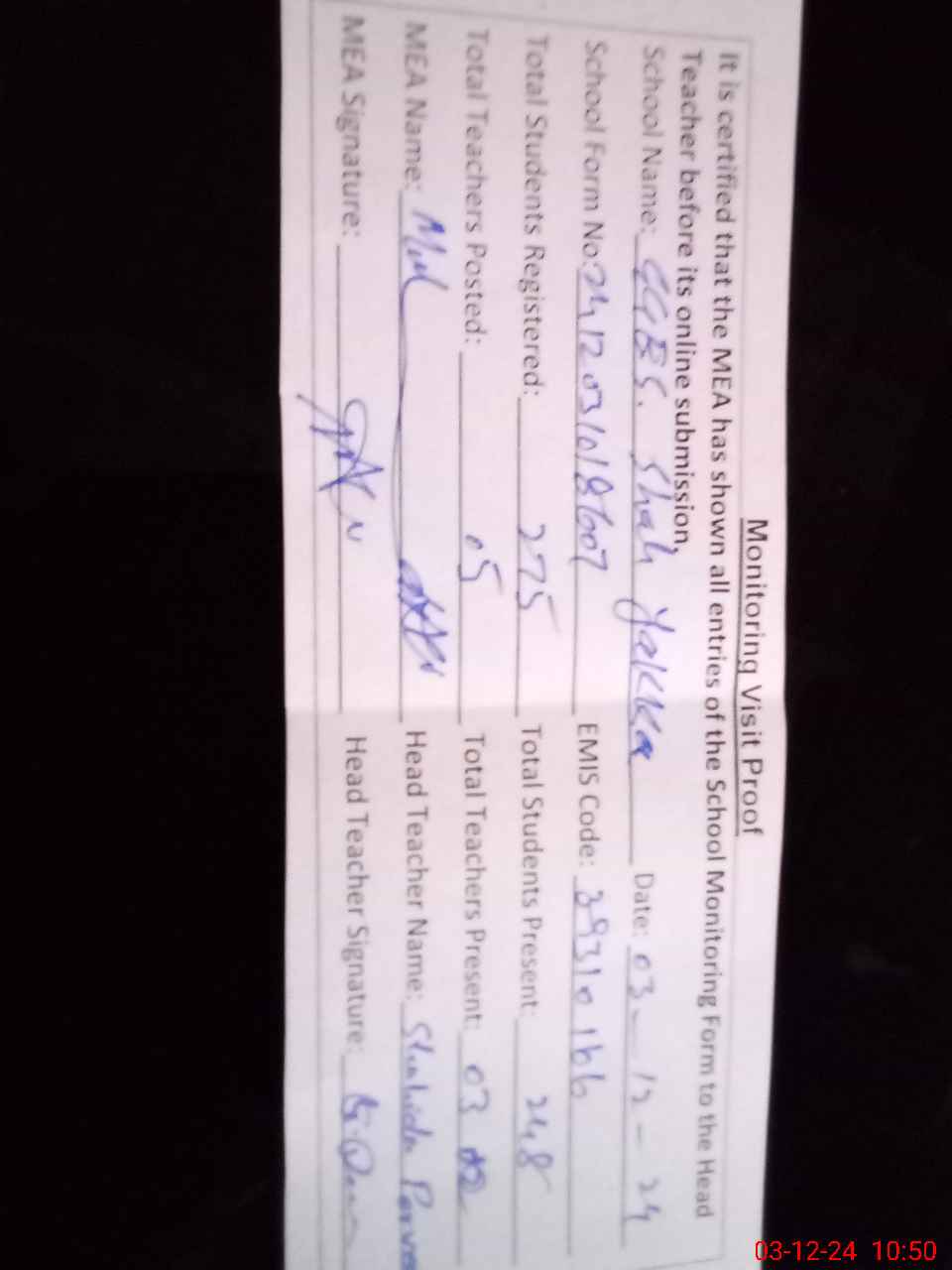 | Name: MA**** SH**** Designation: (School Headmaster's/Headmistress's) SSE Eng Phone/Cell Number: 03**** |