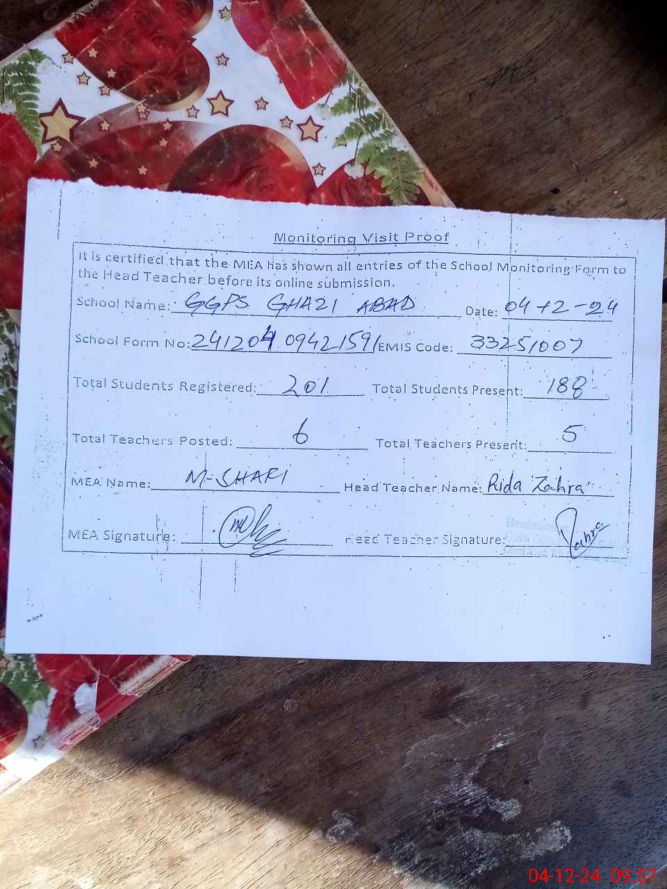 | EMIS Code: 33251007 | Name of School: GGPS GHAZI ABAD | |||