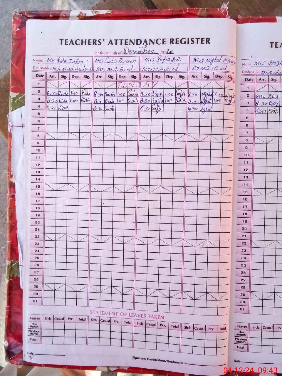 | Leave | Duty | Absent | Maternity | Medical | Ex- Pak |