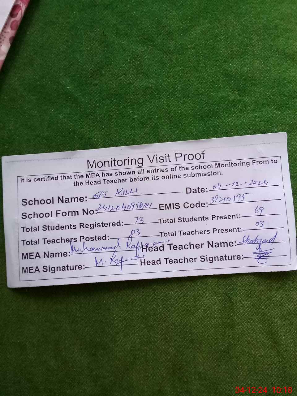 | EMIS Code: 39210195 | Name of School: GPS KILLI PO PAKPATTAN | |||