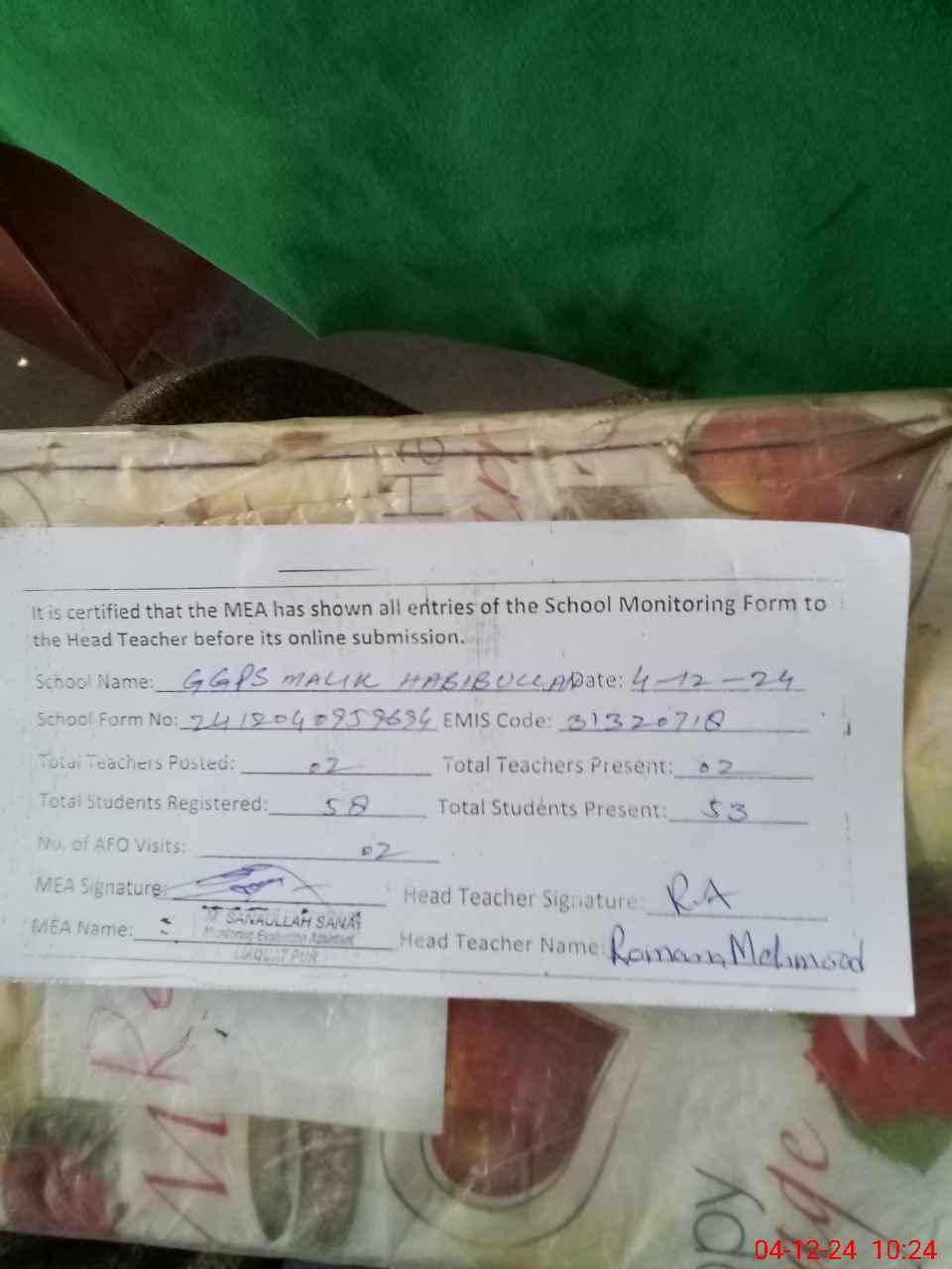 | EMIS Code: 31320718 | Name of School: GGPS MALIK HABIB ULLAH | |||