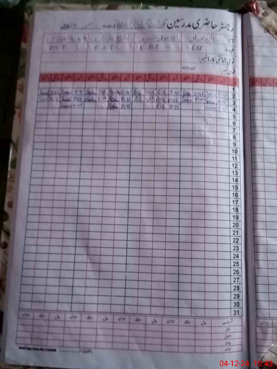 | CNIC | Full Name | Designation | R/C | Absence During Last Calender Month |