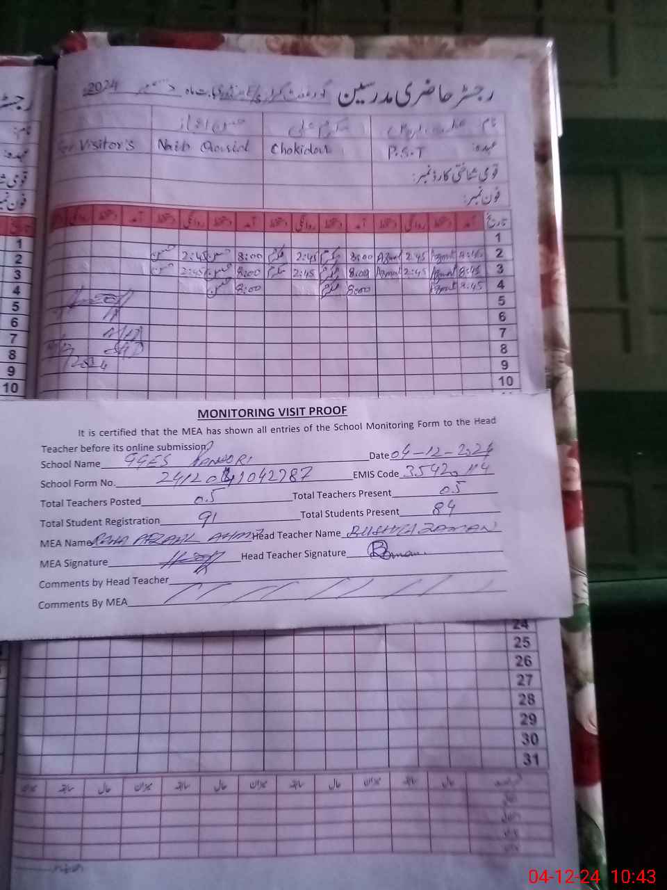| Attendance Register | Head Teacher | MEA with School | Visit Proof |