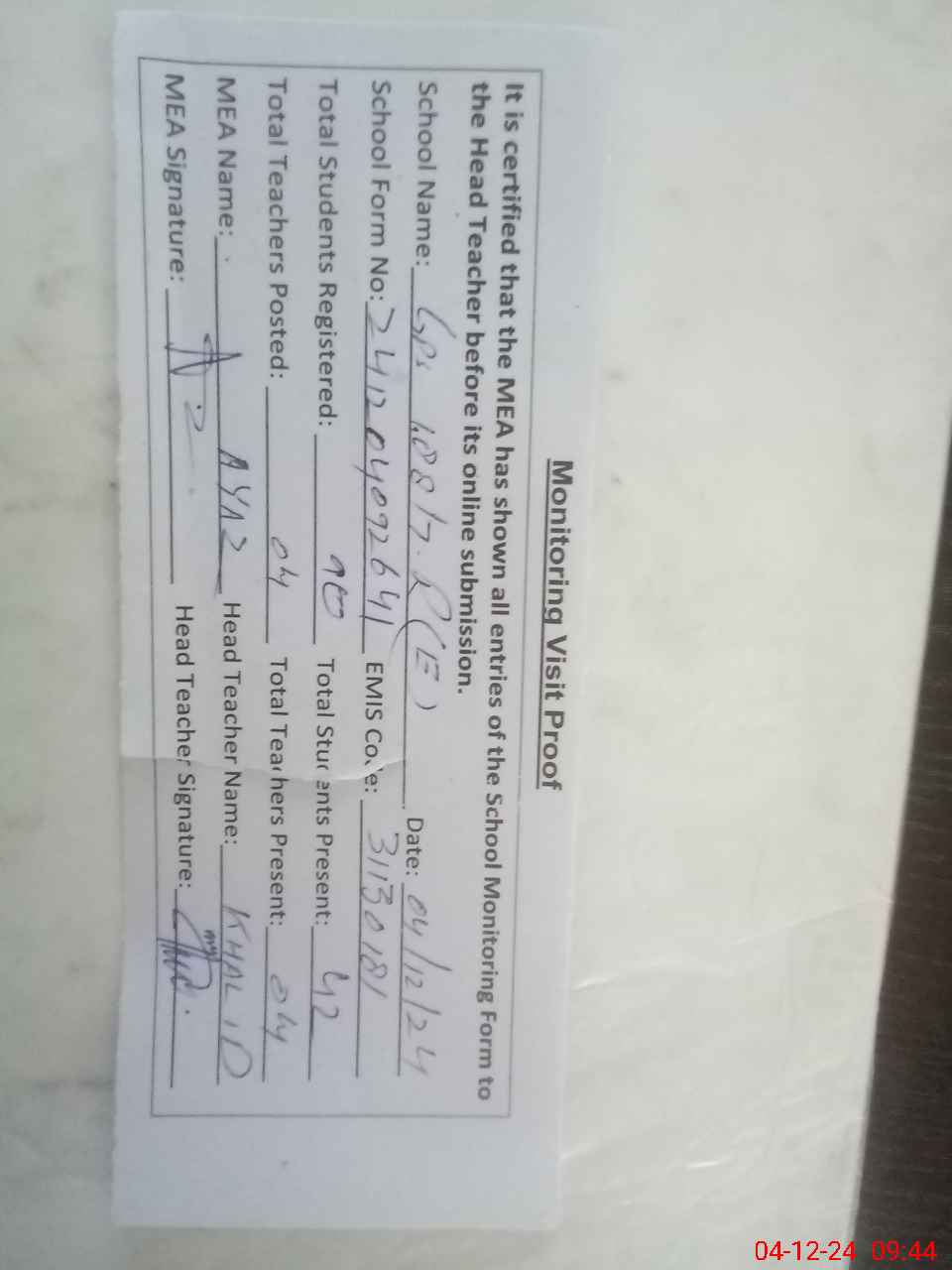 | Attendance Register | Head Teacher | MEA with School | Visit Proof |