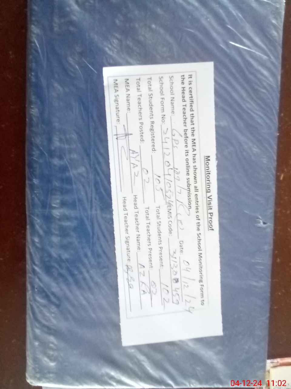 | Attendance Register | Head Teacher | MEA with School | Visit Proof |
