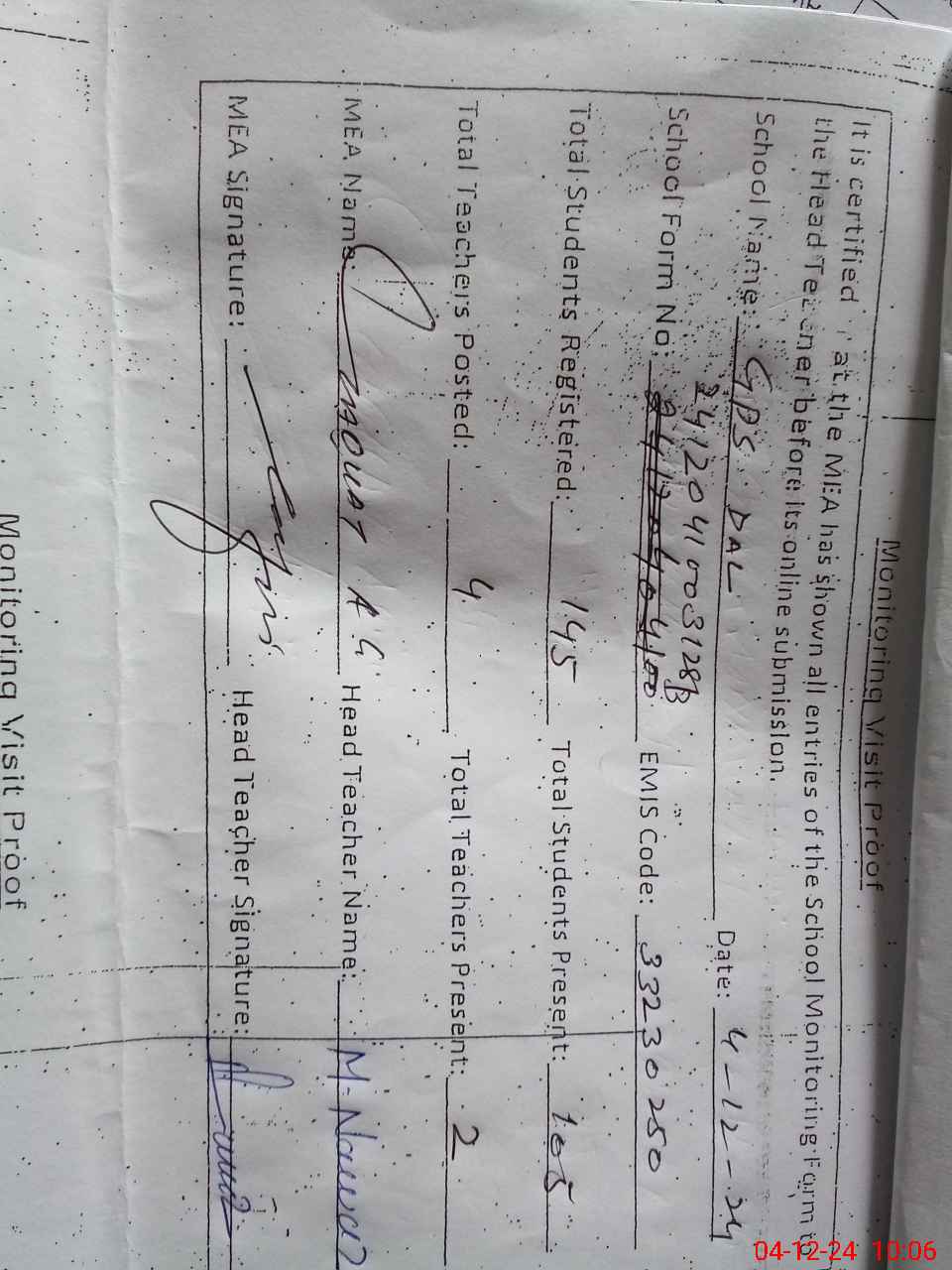 | Attendance Register | Head Teacher | MEA with School | Visit Proof |