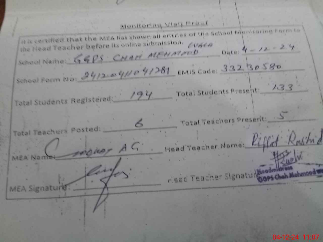 | EMIS Code: 33230580 | Name of School: GGPS CHAH MEHMOOD WALA | |||