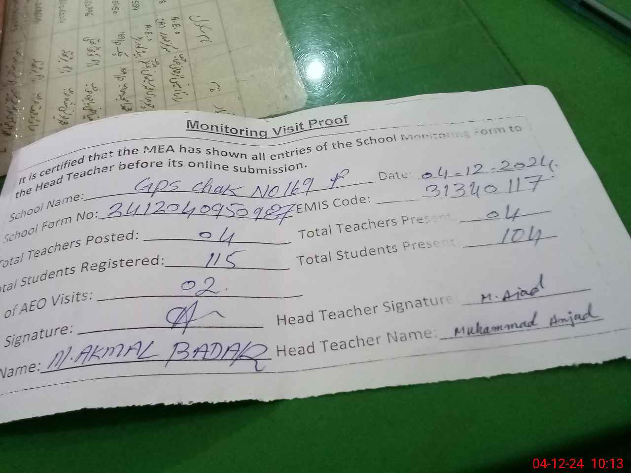 | Attendance Register | Head Teacher | MEA with School | Visit Proof |