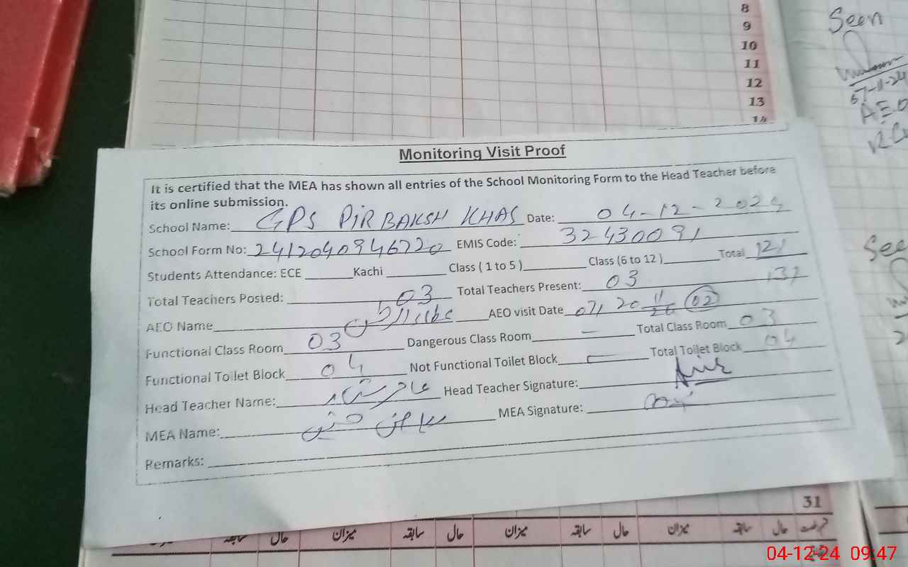 | EMIS Code: 32430091 | Name of School: GPS PIR BAKHSH KHAS | |||