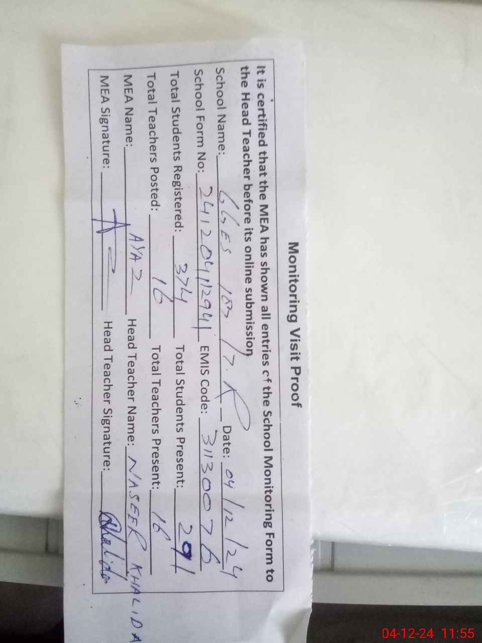 | Attendance Register | Head Teacher | MEA with School | Visit Proof |