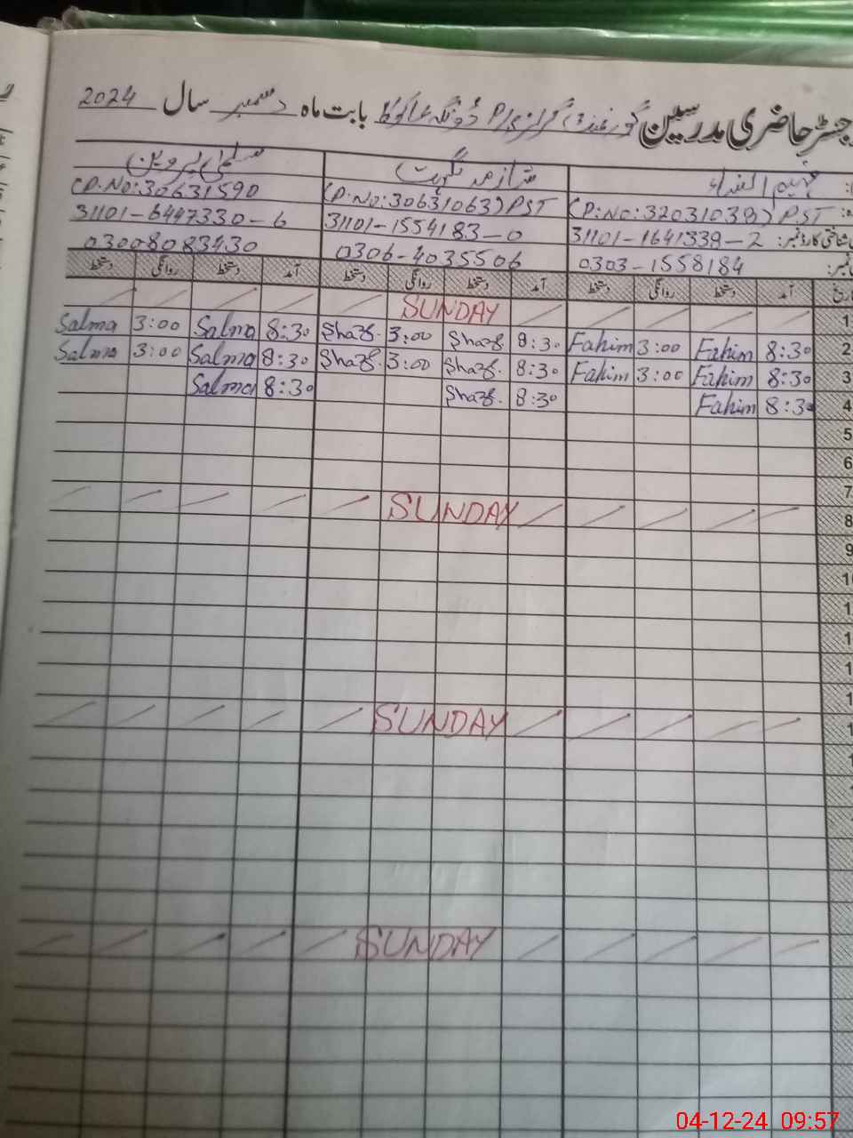 | CNIC | Full Name | Designation | R/C | Absence During Last Calender Month |