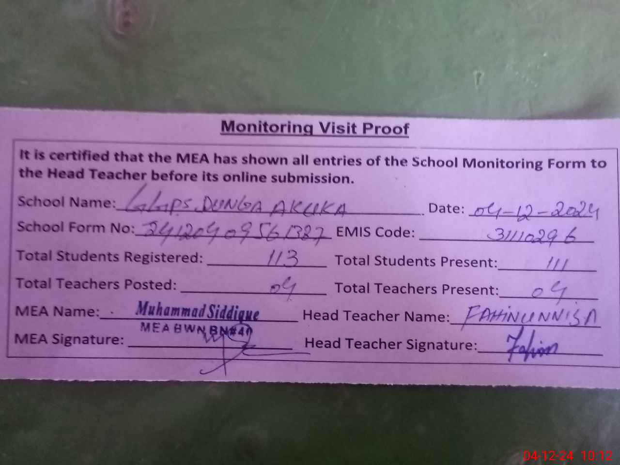 | Attendance Register | Head Teacher | MEA with School | Visit Proof |