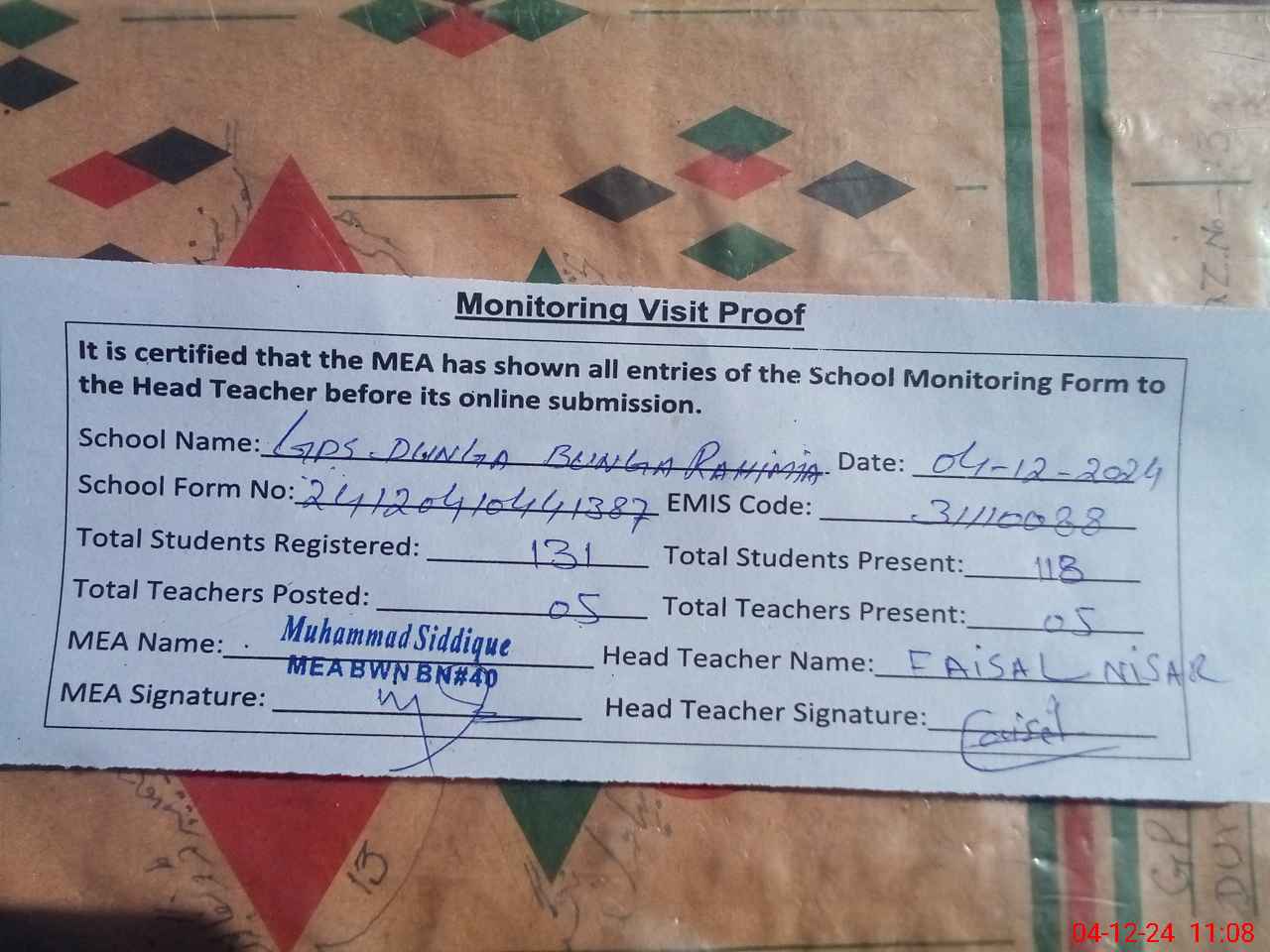 | Attendance Register | Head Teacher | MEA with School | Visit Proof |
