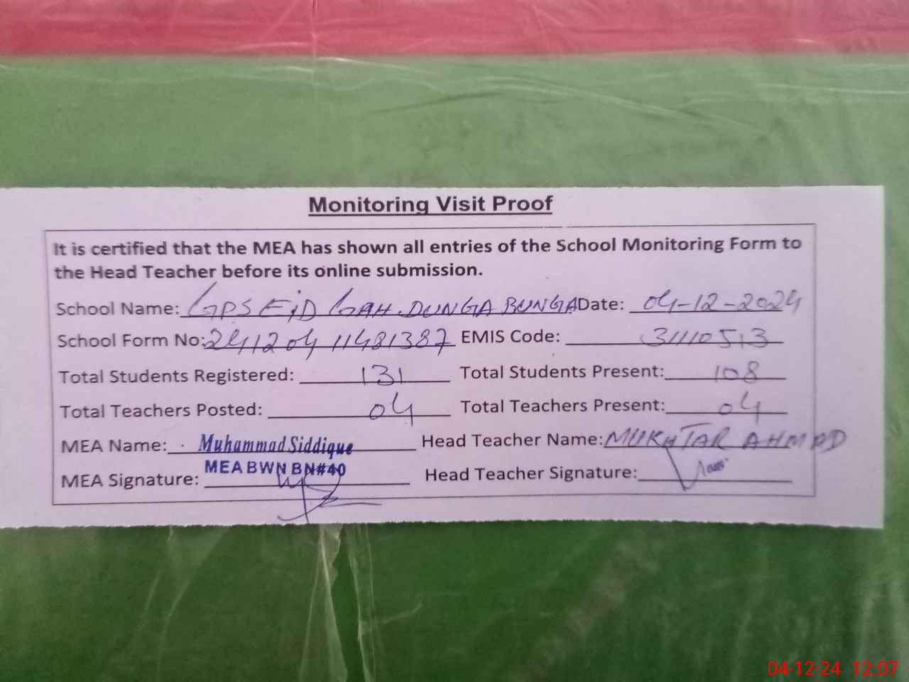 | EMIS Code: 31110513 | Name of School: GPS EID GAH DUNGA BUNGA | |||