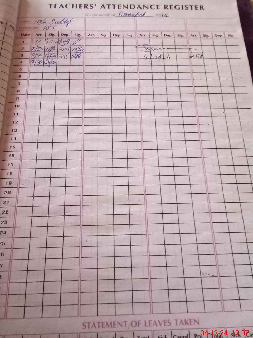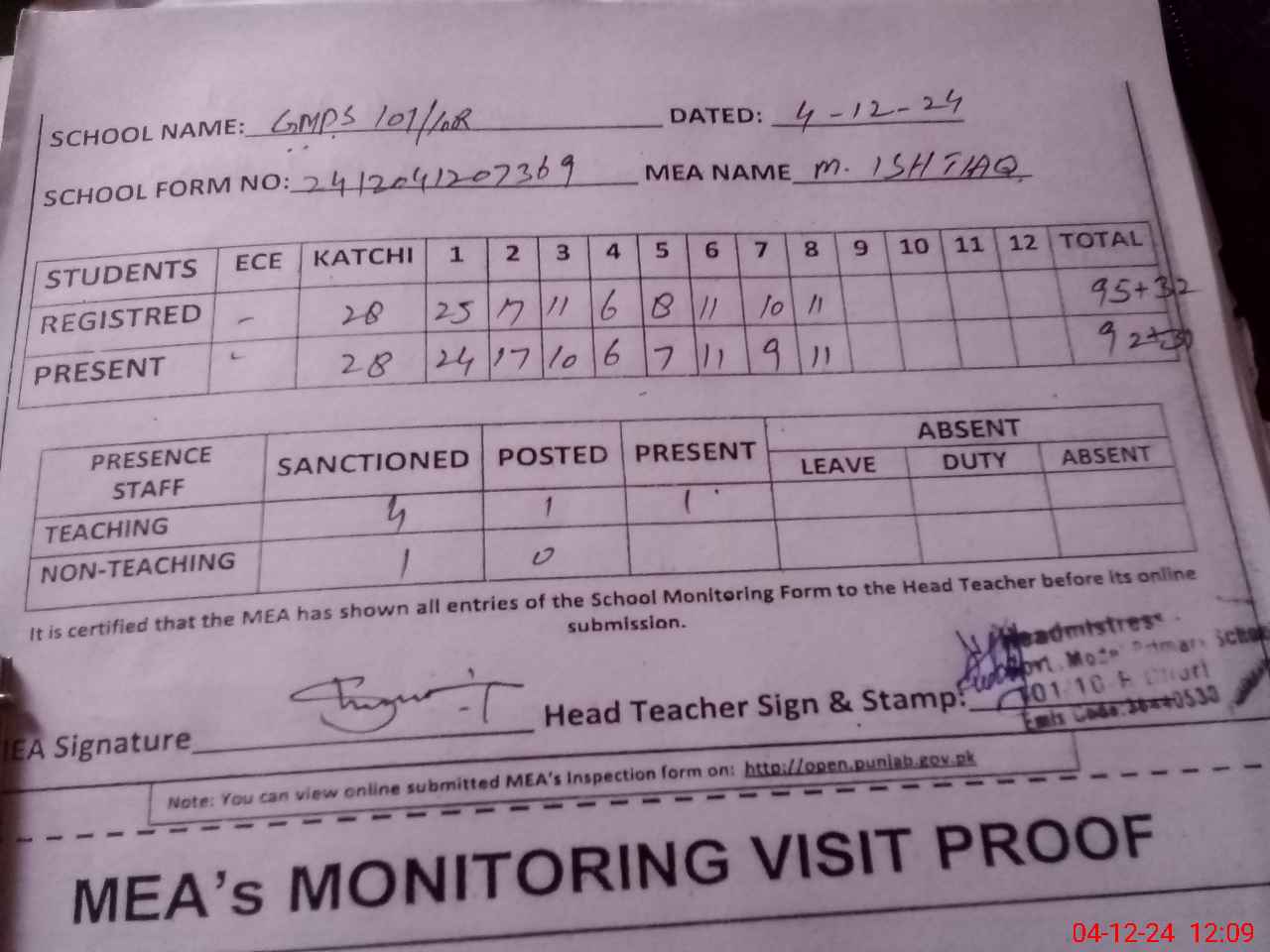 | Attendance Register | Head Teacher | MEA with School | Visit Proof |