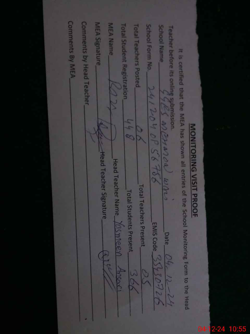 | Attendance Register | Head Teacher | MEA with School | Visit Proof |