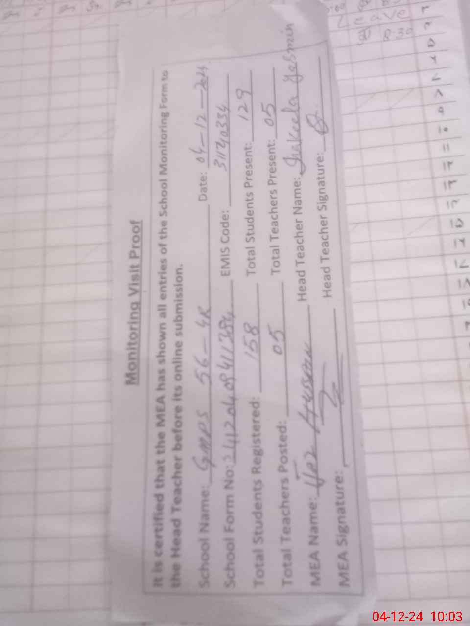 | Attendance Register | Head Teacher | MEA with School | Visit Proof |