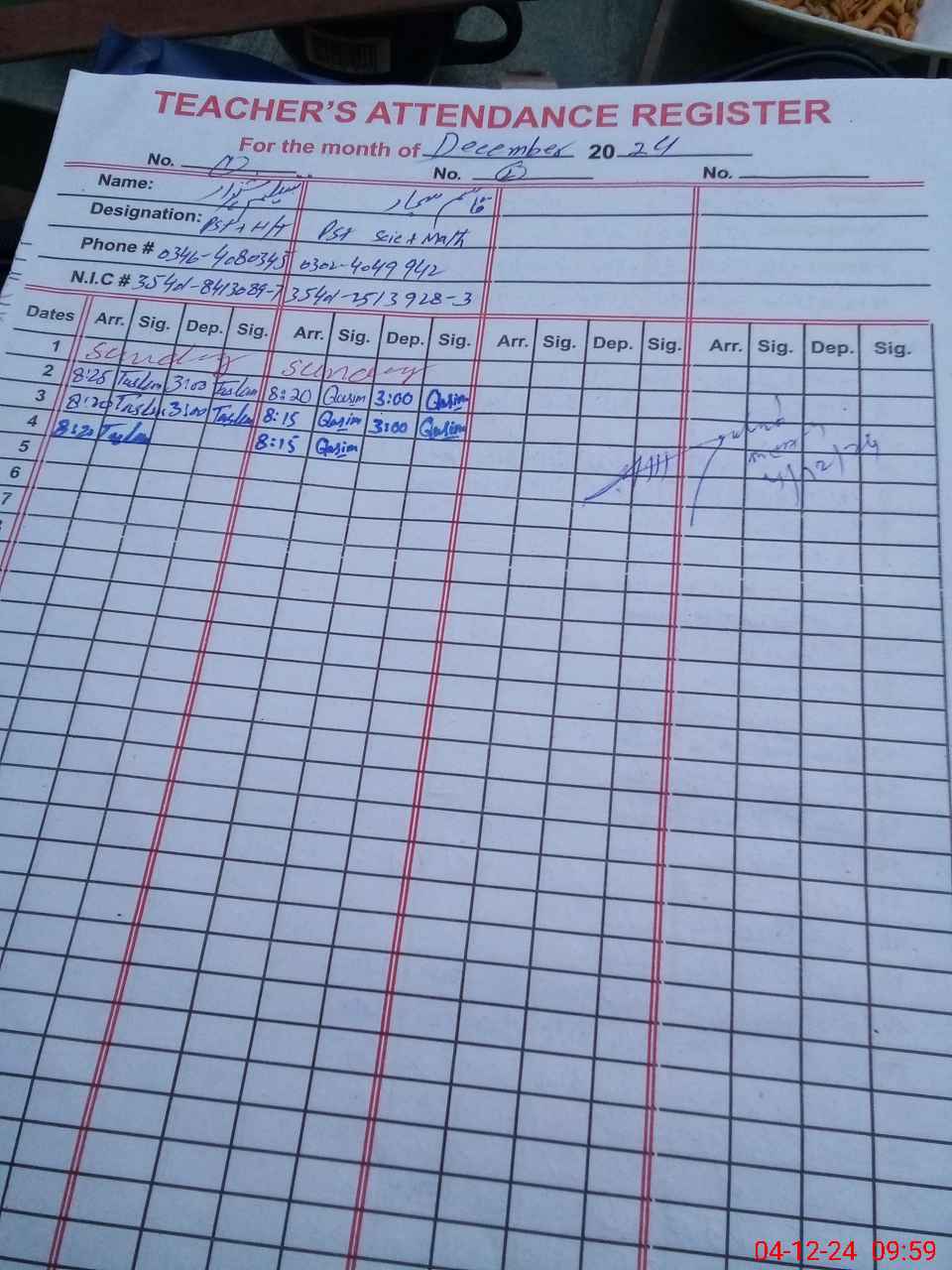 | CNIC | Full Name | Designation | R/C | Absence during last cal. month |