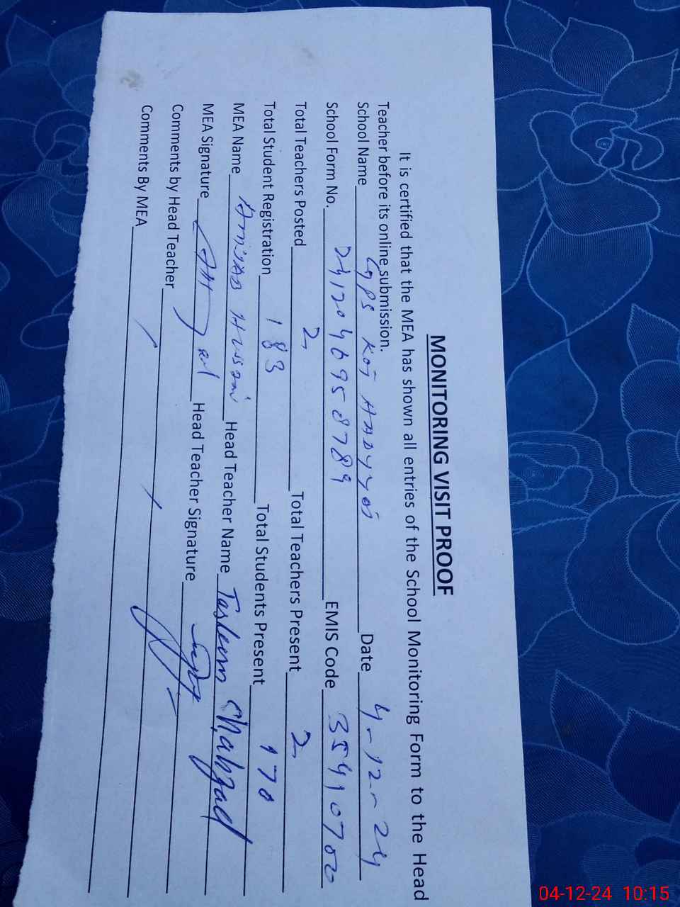 | Attendance Register | Head Teacher | MEA with School | Visit Proof |
