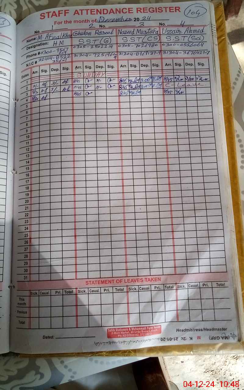 | CNIC | Full Name | Designation | R/C | Absence During Last Calender Month |