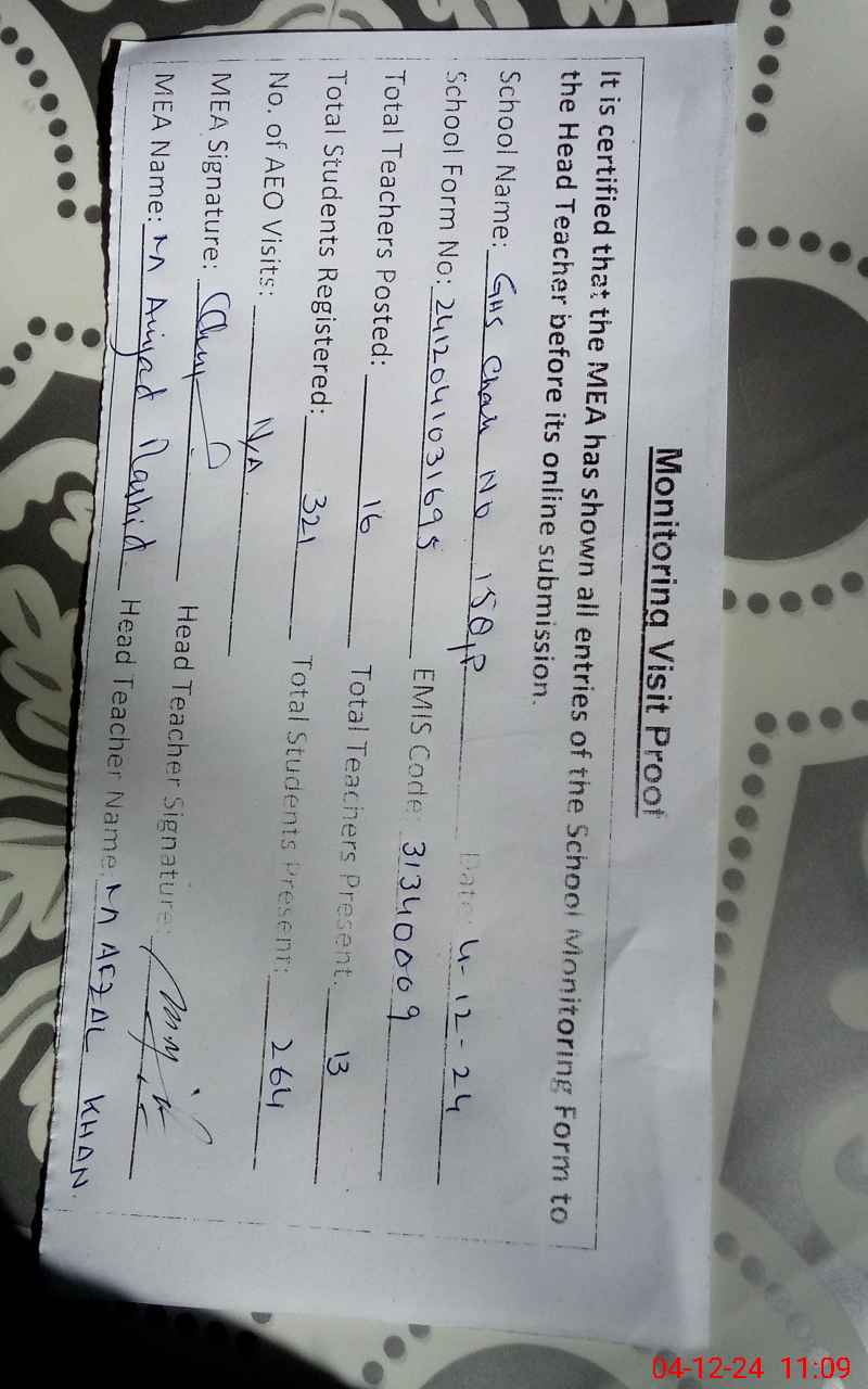 | EMIS Code: 31340009 | Name of School: GHS CHAK NO. 158/P | |||