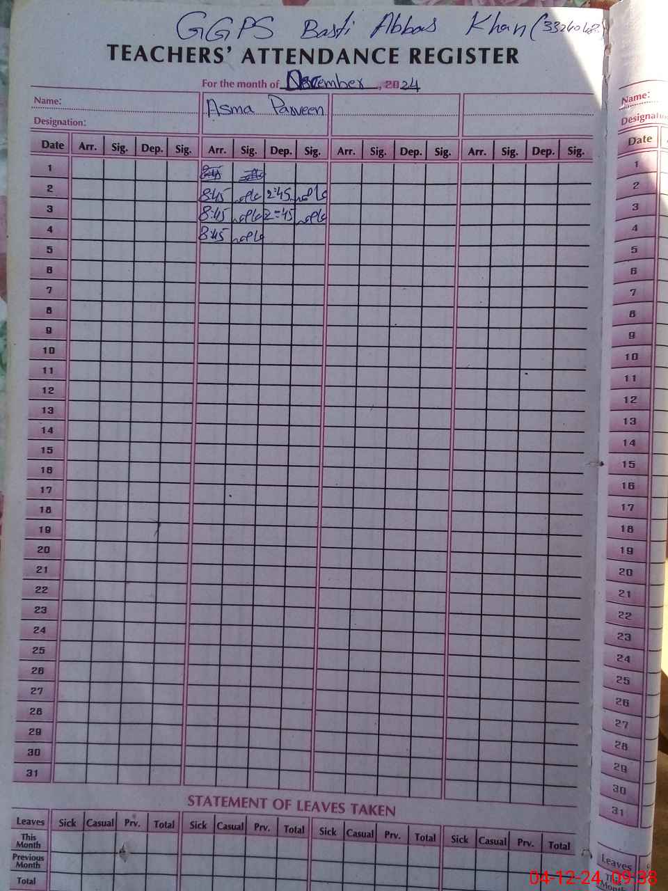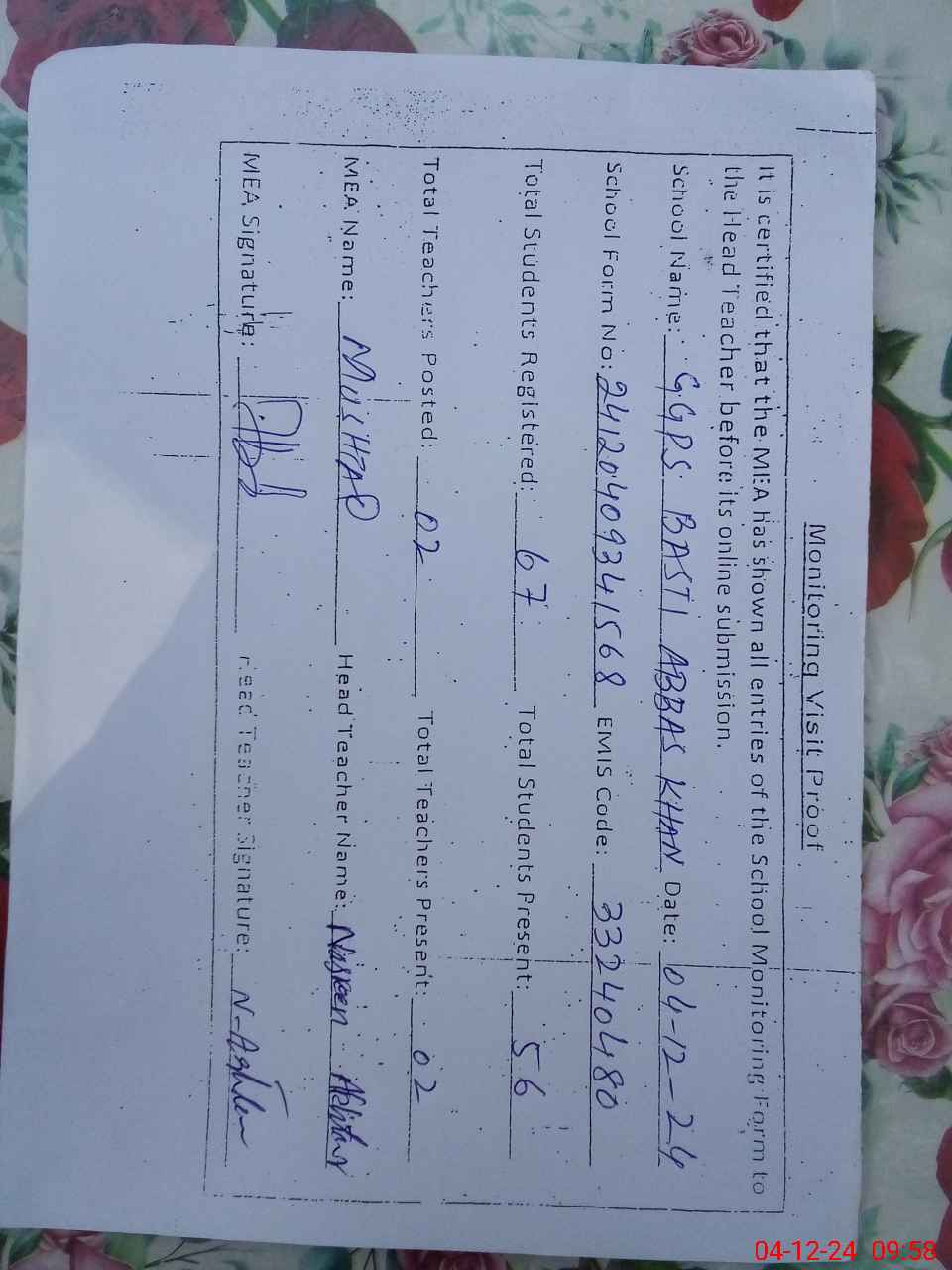 | EMIS Code: 33240480 | Name of School: GGPS BASTI ABBAS KHAN | |||