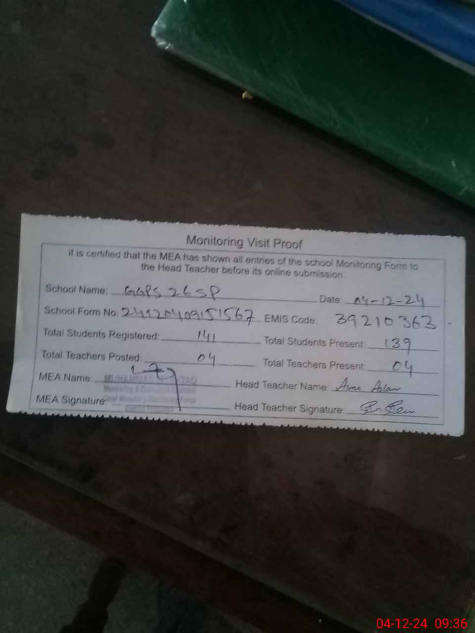 | Attendance Register | Head Teacher | MEA with School | Visit Proof |