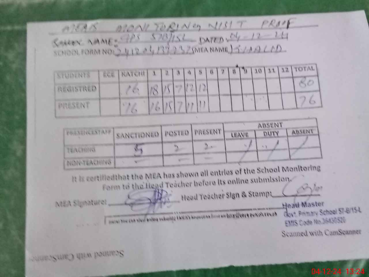 | Attendance Register | Head Teacher | MEA with School | Visit Proof |
