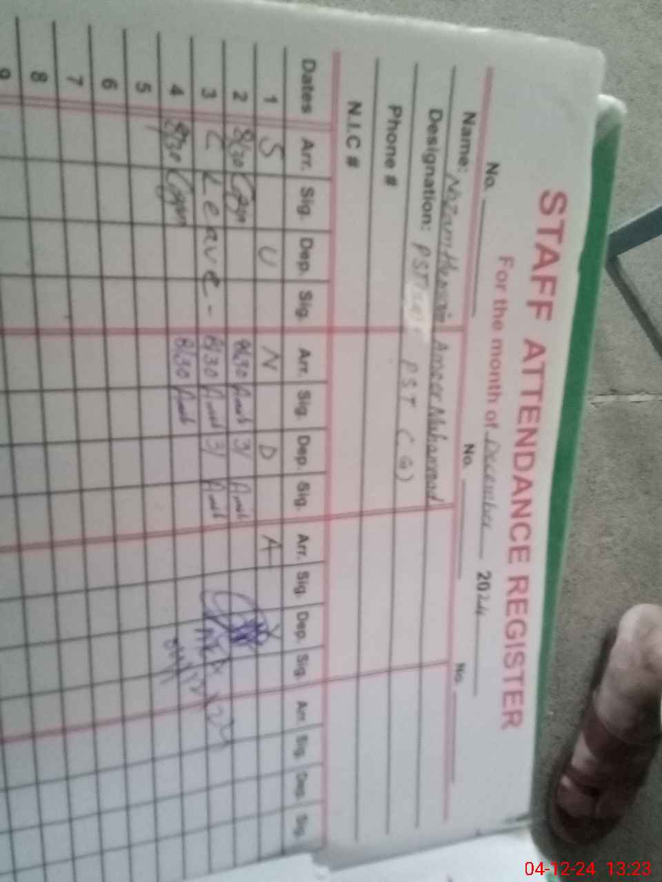 | CNIC | Full Name | Designation | R/C | Absence during last cal. month |