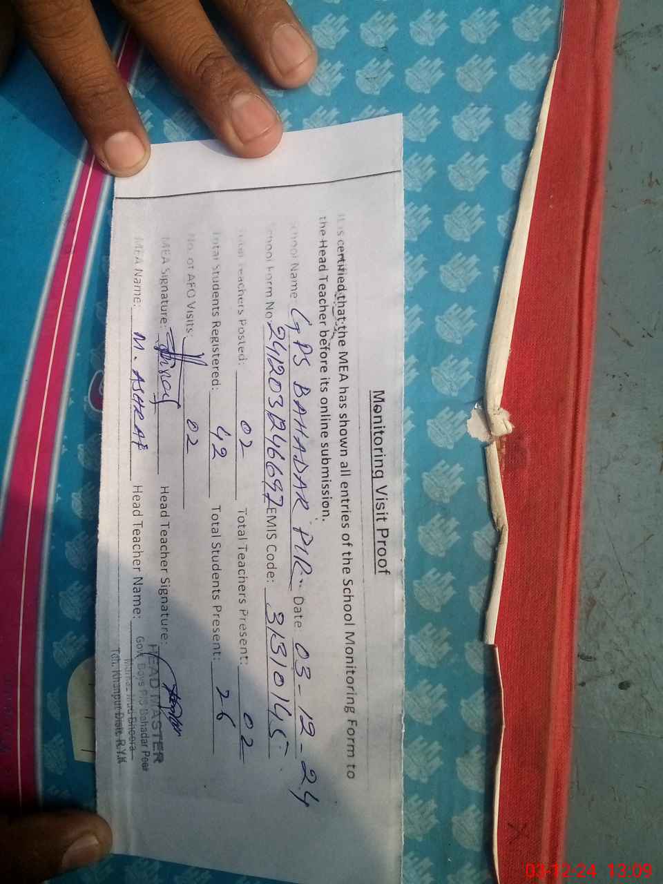 | Attendance Register | Head Teacher | MEA with School | Visit Proof |