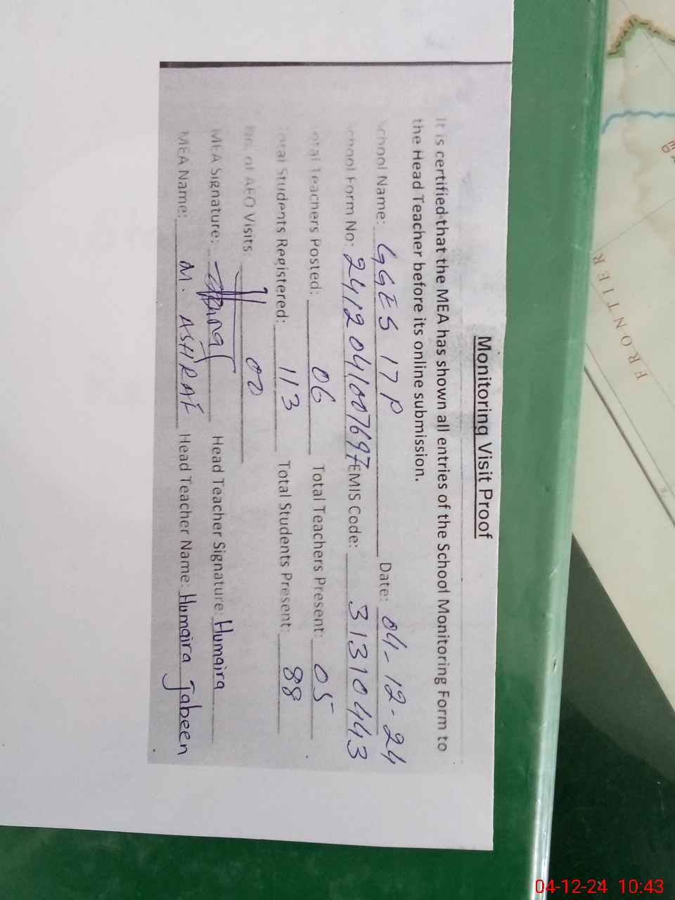 | Certified that this School was Inspected by the Undersigned MEA/DMO Today and the Information Stated Above is as Per Record. | |||||