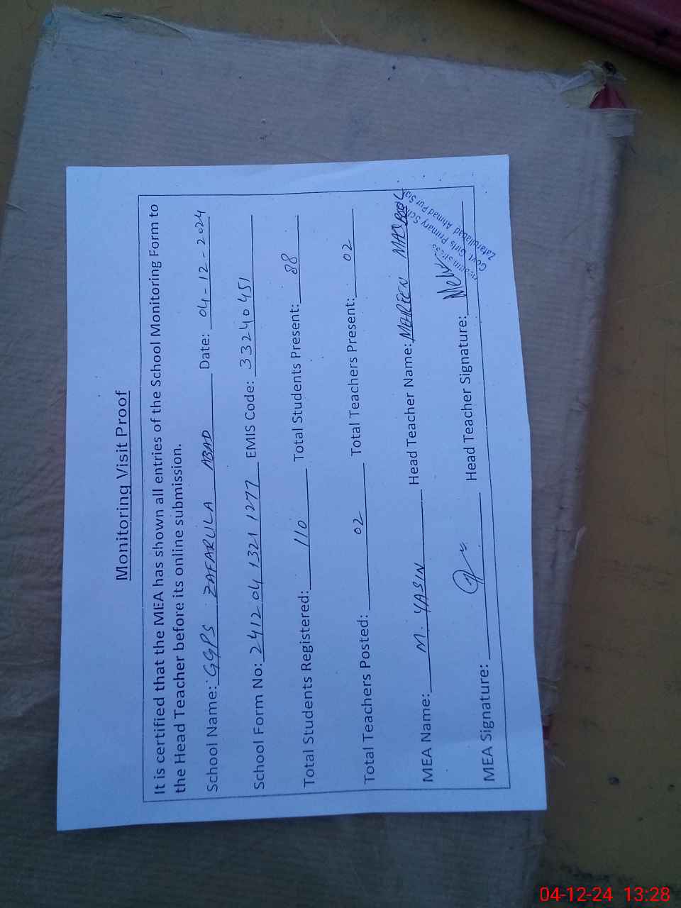 | EMIS Code: 33240451 | Name of School: GGPS ZAFARULA ABAD | |||