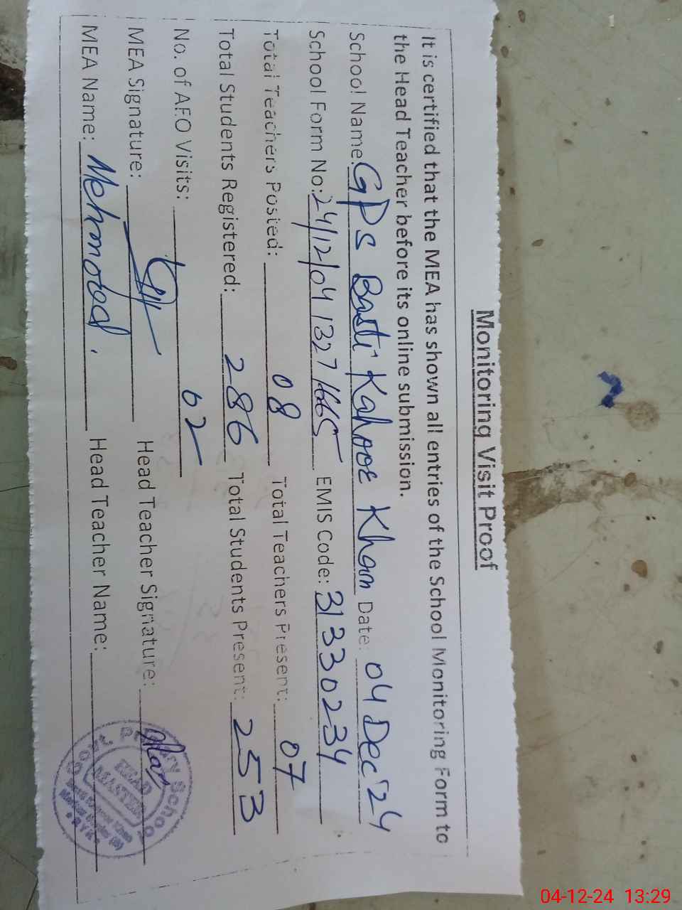 | Attendance Register | Head Teacher | MEA with School | Visit Proof |
