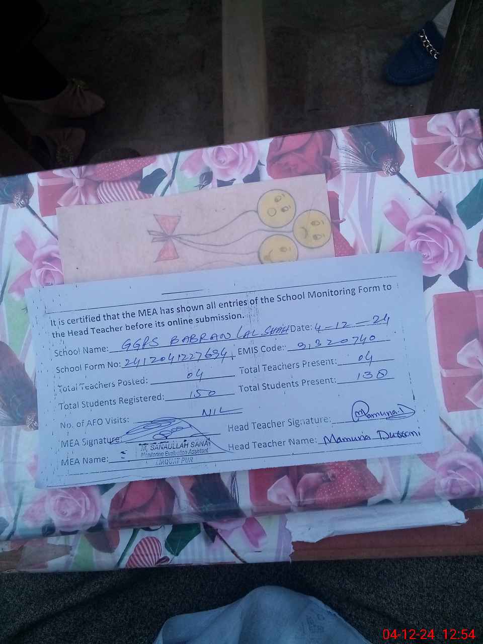 | Attendance Register | Head Teacher | MEA with School | Visit Proof |