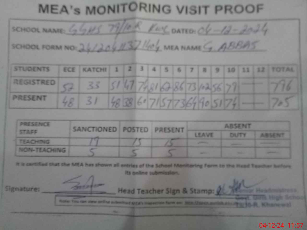 | Attendance Register | Head Teacher | MEA with School | Visit Proof |