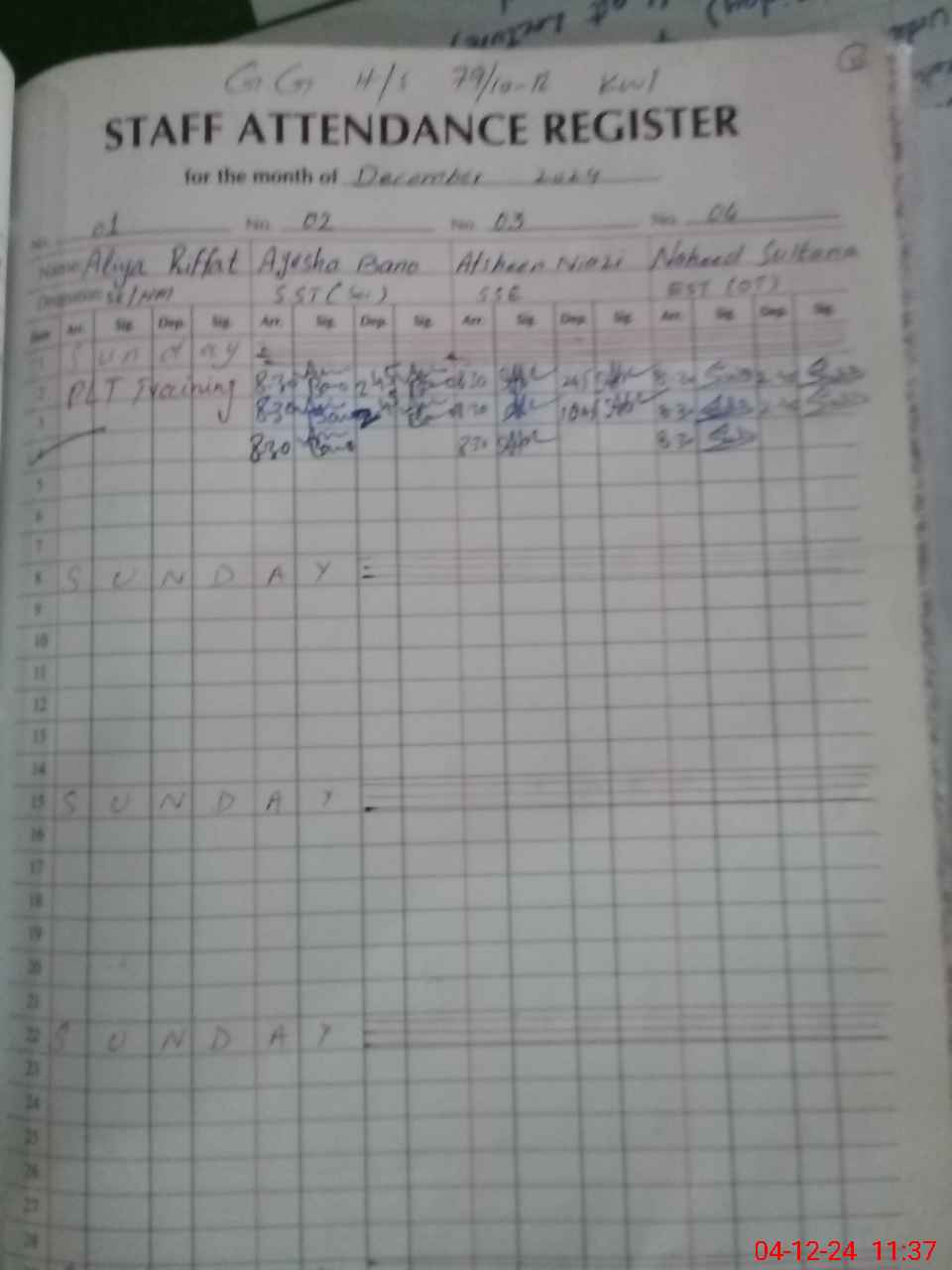 | CNIC | Full Name | Designation | R/C | Absence During Last Calender Month |
