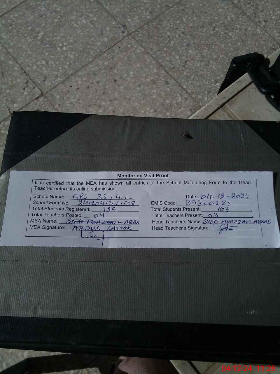 | Attendance Register | Head Teacher | MEA with School | Visit Proof |
