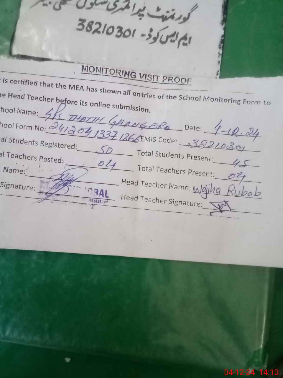 | Attendance Register | Head Teacher | MEA with School | Visit Proof |