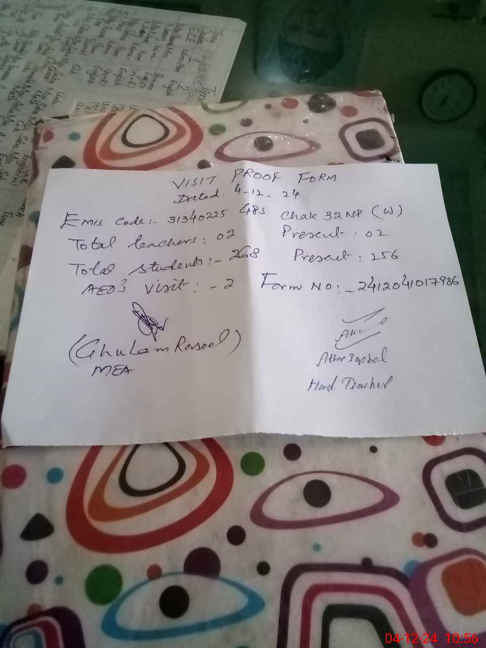 | Attendance Register | Head Teacher | MEA with School | Visit Proof |