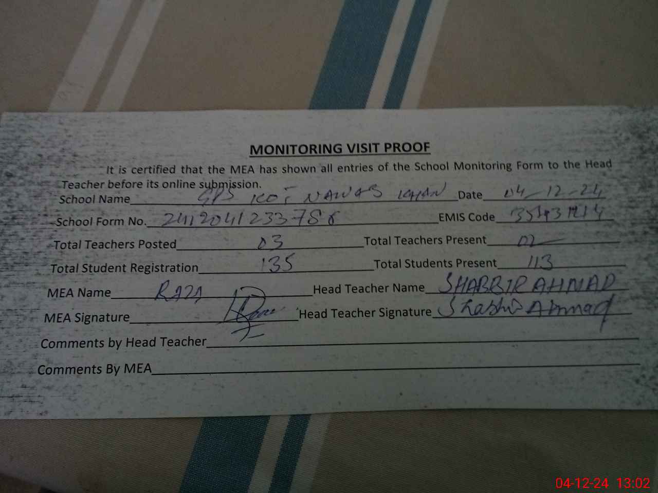 | Attendance Register | Head Teacher | MEA with School | Visit Proof |