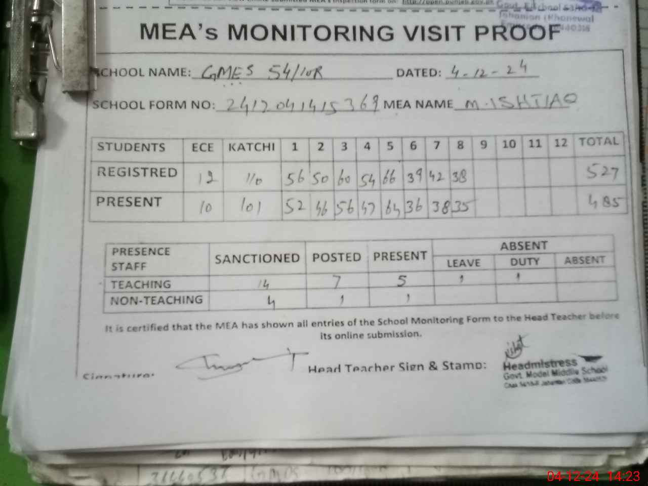 | Attendance Register | Head Teacher | MEA with School | Visit Proof |