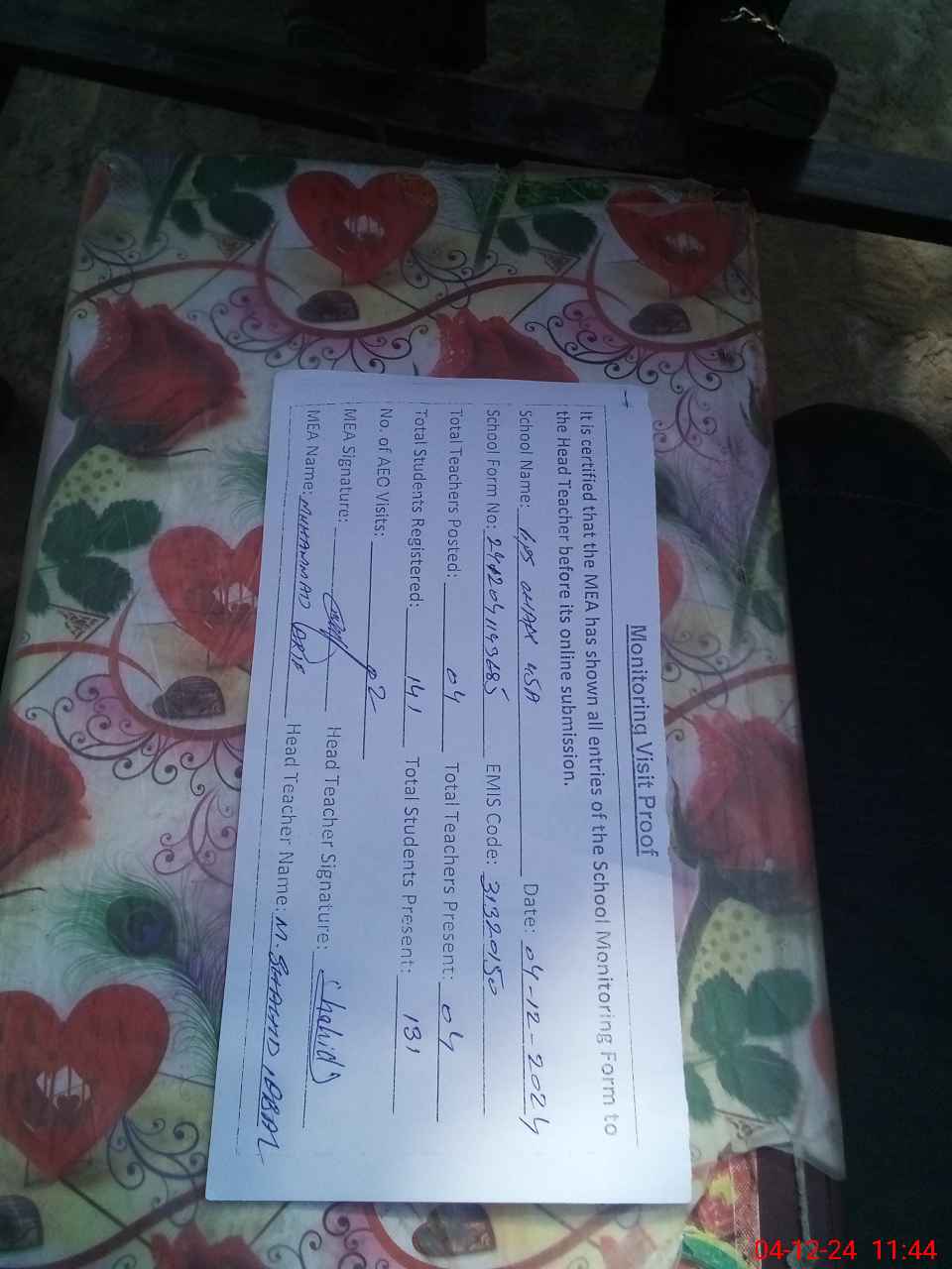 | Attendance Register | Head Teacher | MEA with School | Visit Proof |