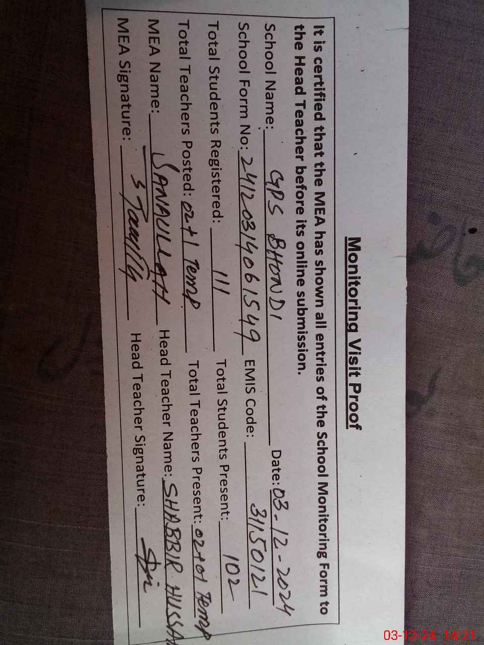 | EMIS Code: 31150121 | Name of School: GPS BHONDI | |||