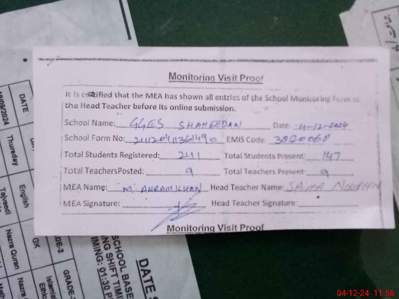 | Attendance Register | Head Teacher | MEA with School | Visit Proof |