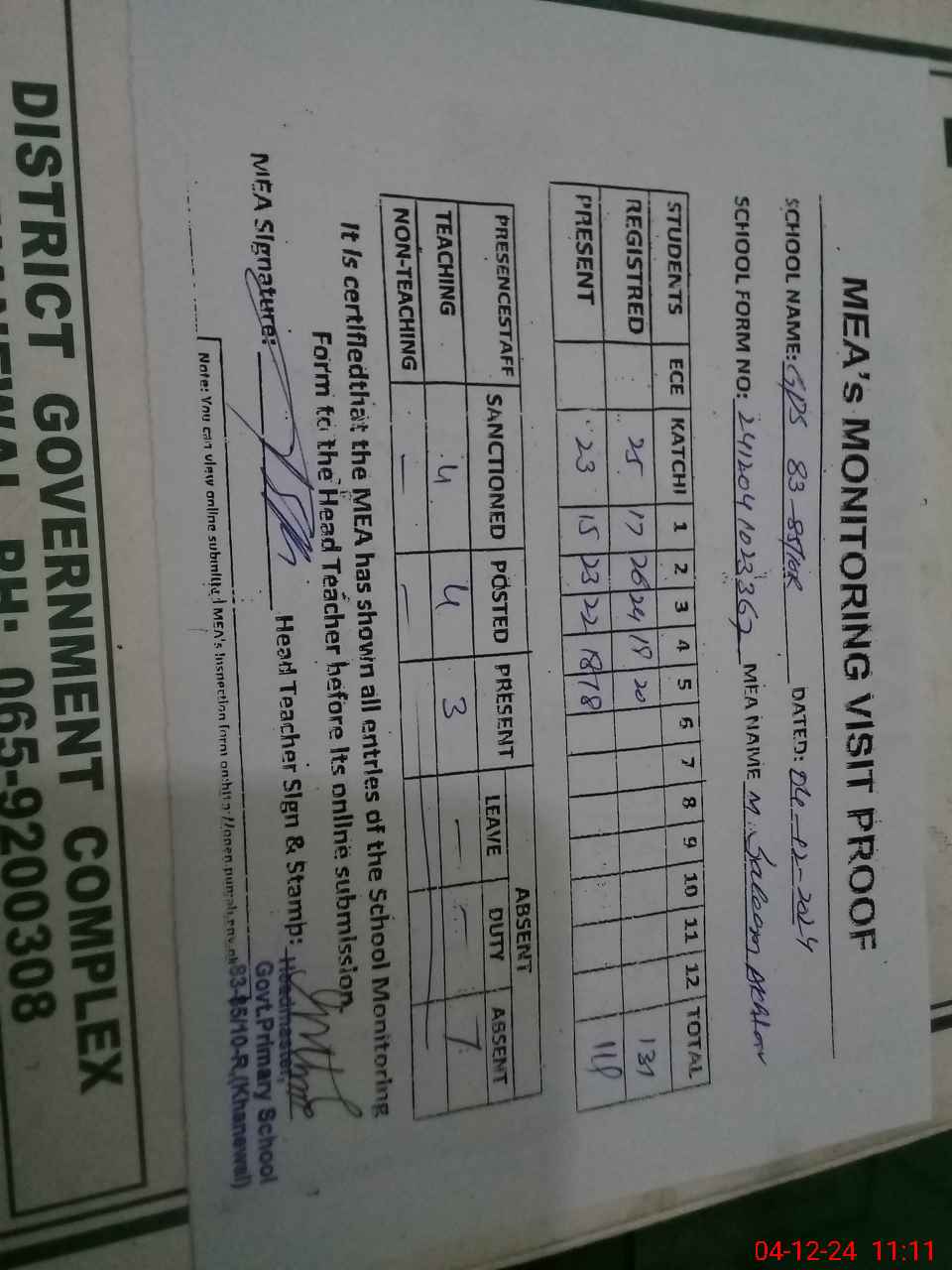 | Attendance Register | Head Teacher | MEA with School | Visit Proof |