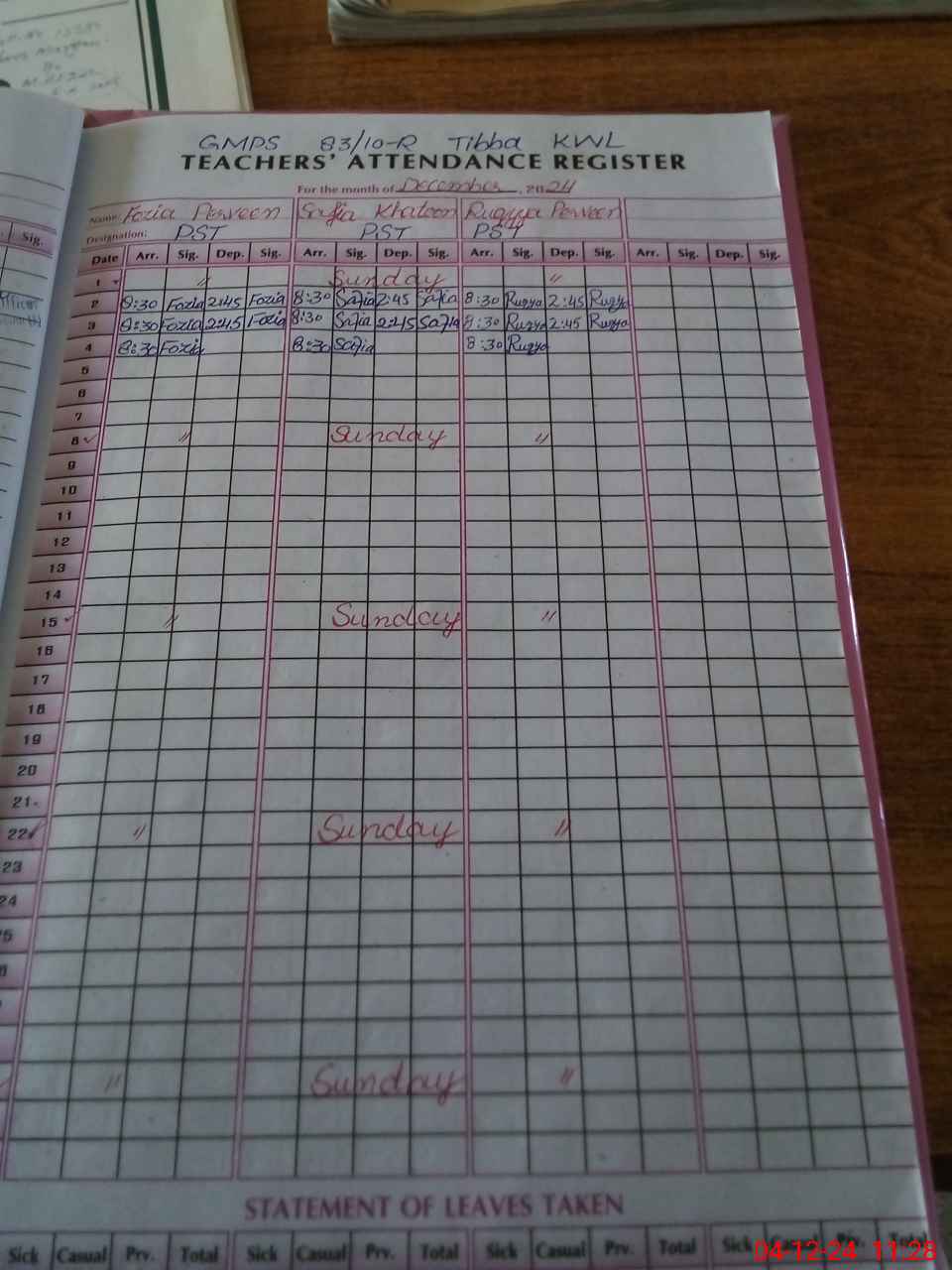 | CNIC | Full Name | Designation | R/C | Absence During Last Calender Month |