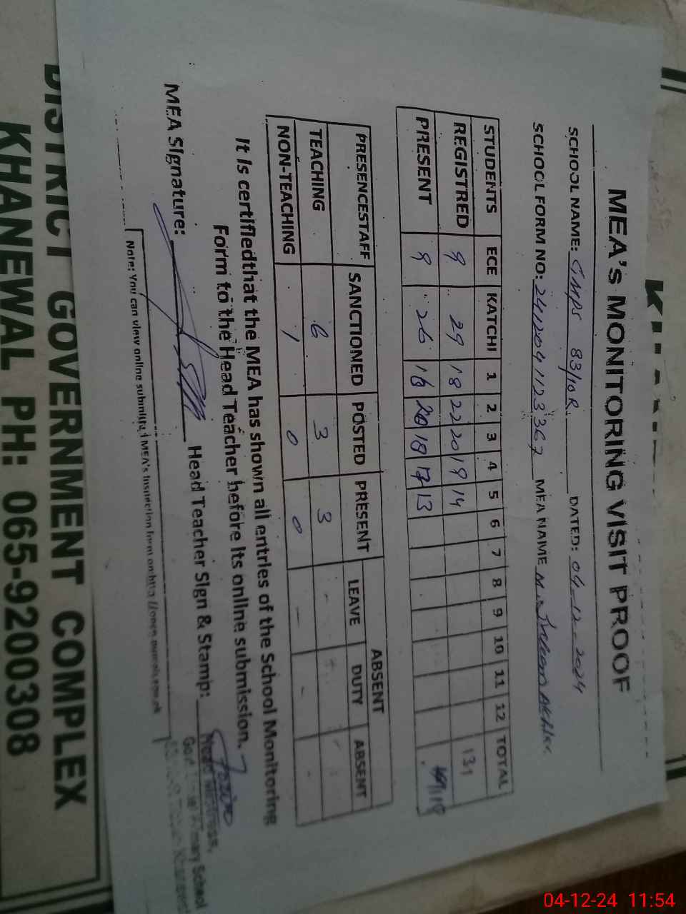 | Attendance Register | Head Teacher | MEA with School | Visit Proof |
